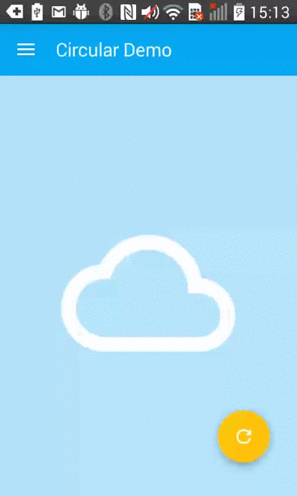 //myTargetView & mySourceView are children in the CircularFrameLayoutfloatfinalRadius = CircularAnimationUtils.hypo(width, height); //getCenter computes from 2 view: One is touched, and one will be animated, but you can use anything for centerint[] center = CircularAnimationUtils.getCenter(fab, myTargetView); animator = CircularAnimationUtils.createCircularTransform(myTargetView, mySourceView, center[0], center[1], 0F, finalRadius); animator.setInterpolator(newAccelerateDecelerateInterpolator()); animator.setDuration(1500); animator.start();Reveal: