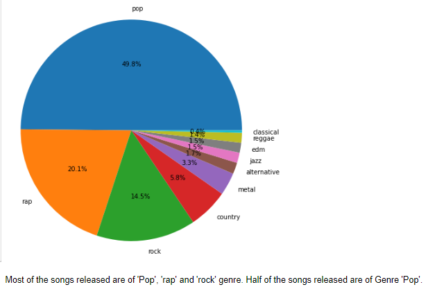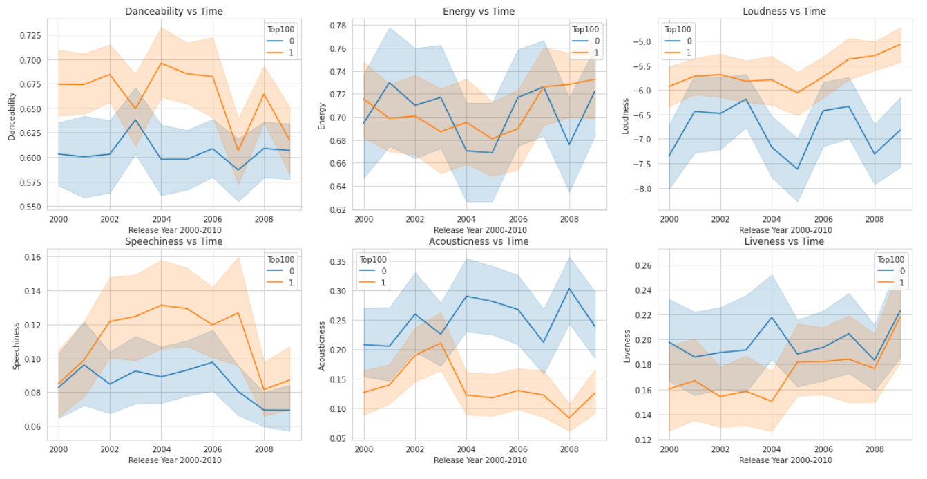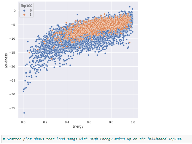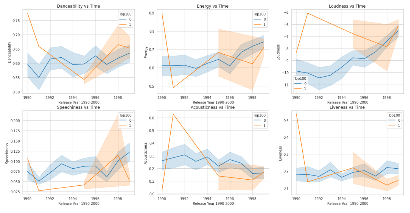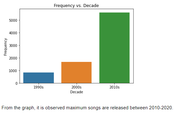1) The countplot of the output Column 2) Distribution of Genre 3)Distribution of song features 4)Distribution of frequency over three decades 5)Correlation between columns 6)Feature v/s Decade 1990-2000 7)Feature v/s Decade 2000-2010 8)Feature v/s Decade 2000-2010 9)Feature Comparisons The graphs in the code show the separability in the data when compared across two unique Spotify features; this suggests that data may separate across an n-dimensional feature space. Given this, the problem can alternatively be posed as an unsupervised learning problem where clustering methods can classify the data.