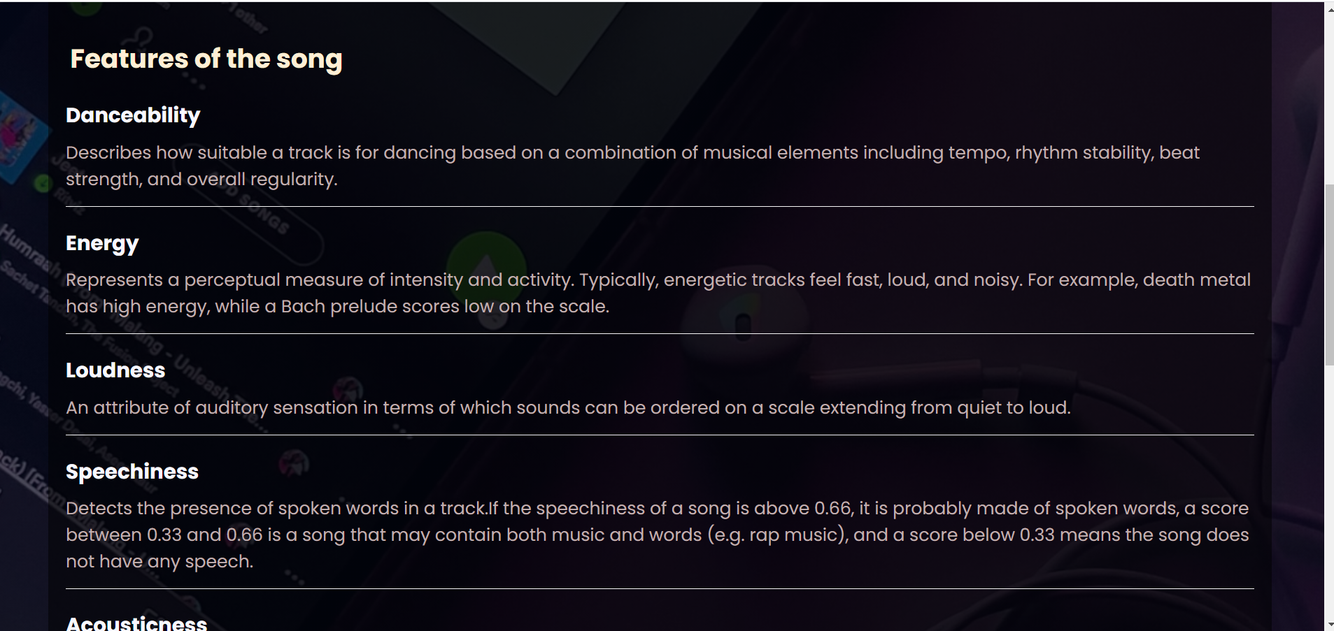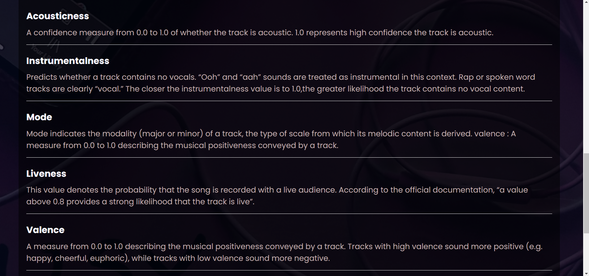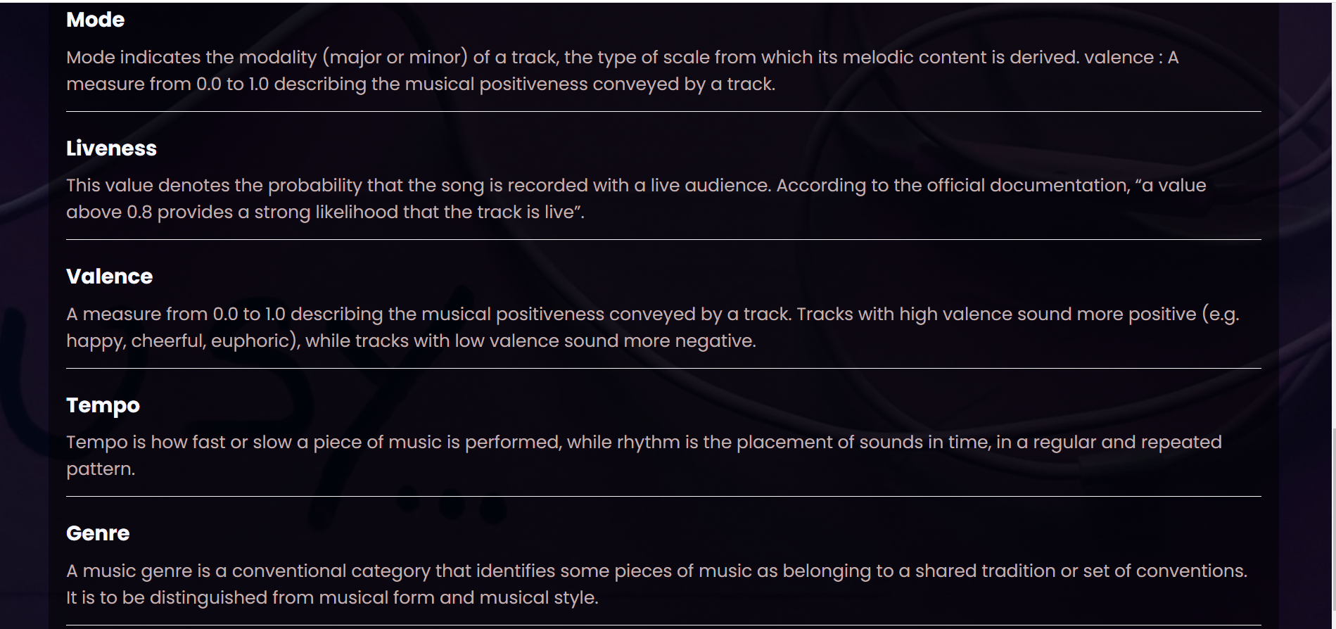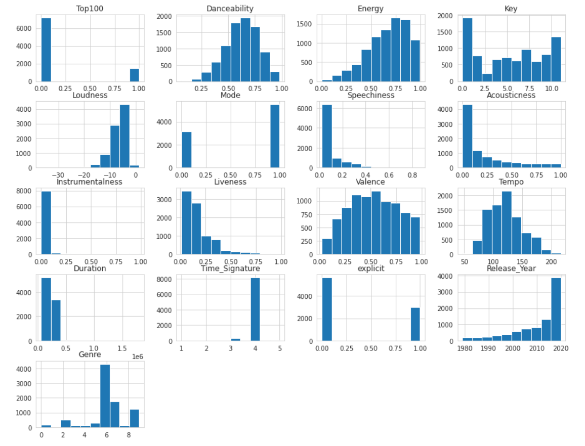 3)Audio Features for each song were extracted from the Spotify web API and the final dataset was provided to our team.