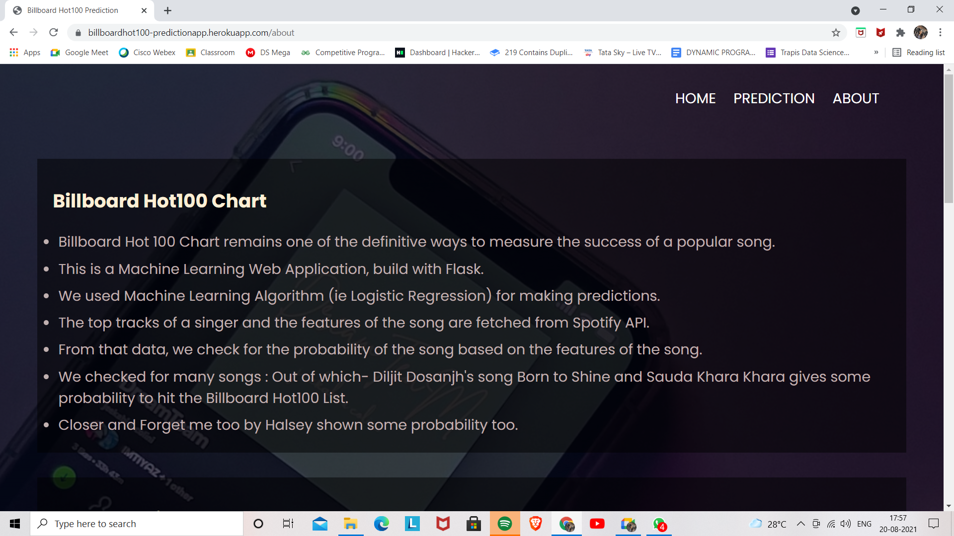 4)Task was to take input from user about audio features and to predict whether the Song will be in the billboard list or not