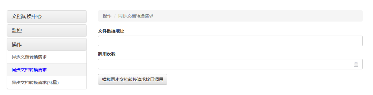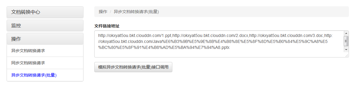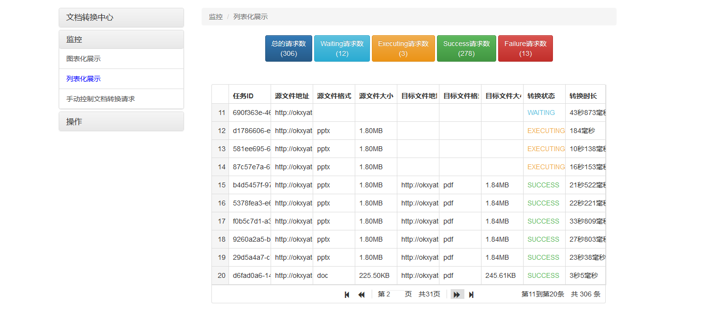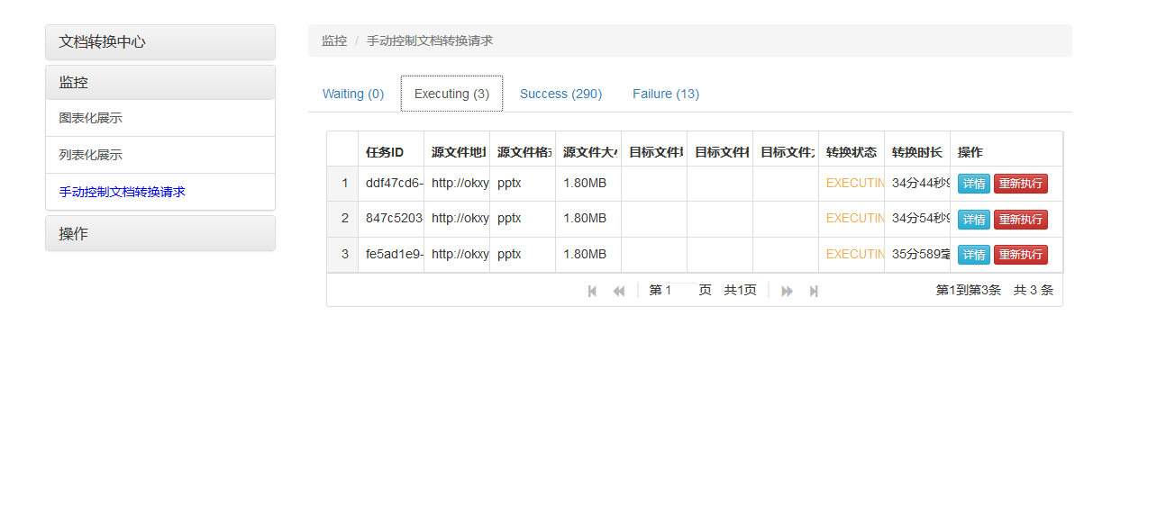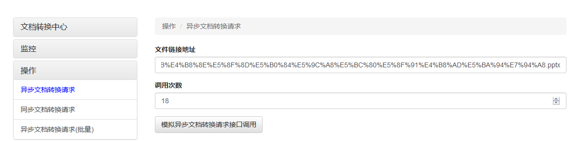 EXECUTING:正在执行中的任务队列,文档转换中心应用重启不可以继续执行,需要管理员手动重新执行。  异步文档转换请求模拟  同步文档转换请求模拟  异步文档转换请求模拟(批量)