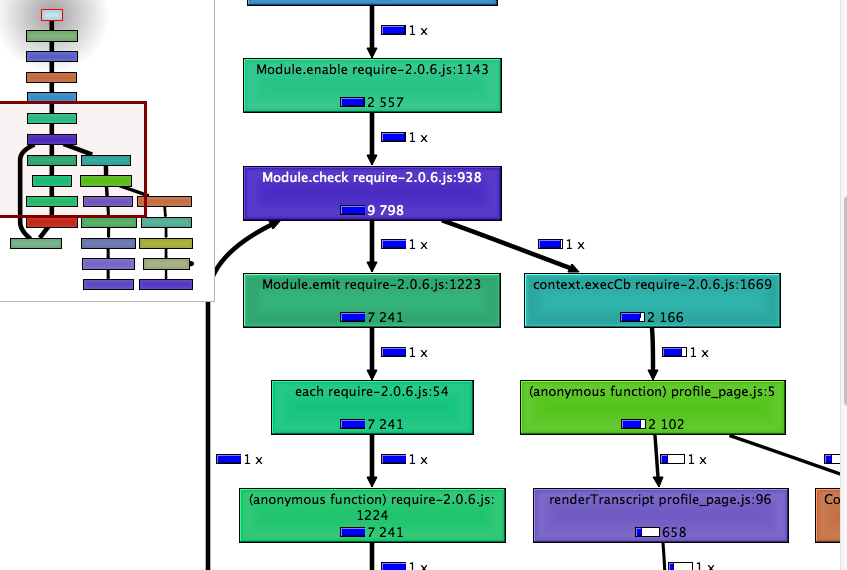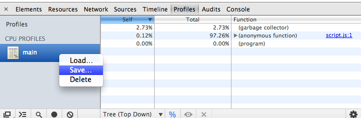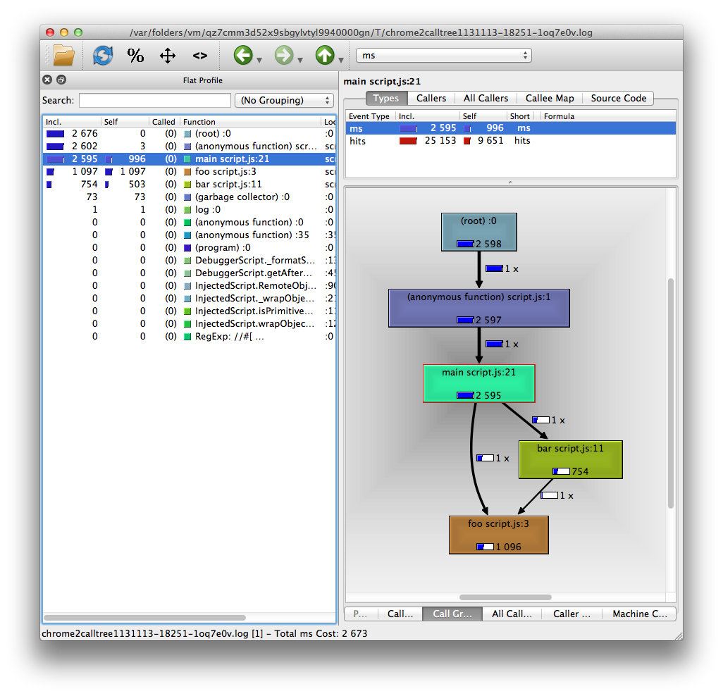 npm install -g chrome2calltree Collect a Chrome CPU profile either by using console.profile() or by clicking buttons in the Developer Tools. Save the profile somewhere to disk.