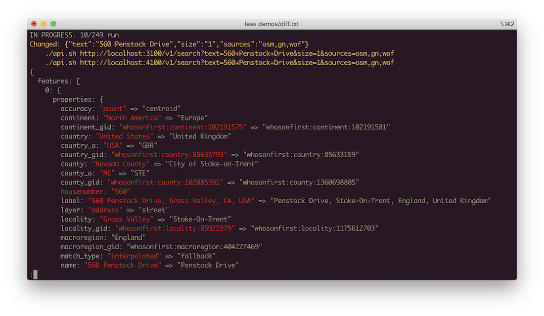 api-diff \ --old.host http://names.drycodes.com/ \ --new.host http://names.drycodes.com/ \ --input_queries docs/examples/input-names-drycodes.txt api-diff \ `# defaults to http, port 80` \ --new.host localhost:3100 \ --old.host localhost:4100 \ `# csv input, use headings as query parameter keys` \ --input_csv ~/RadarCode/geocode-acceptance-tests/input/addresses.csv \ `# remap csv column "query" to query param "text"` \ --key_map query=text \ `# run against /v1/search on our hosts` \ --endpoint /v1/search \ `# extra options to append to every query` \ --extra_params size=1 sources=oa,osm \ `# ignore all fields named these things in computing our diff` \ --ignored_fields bbox geometry attribution timestamp \ `# filter down responses to the first entry in the "addresses" array \ --response_filter '$.addresses[0]' \ `# output an interactive html diff. other options are text and json` \ --output_mode html \ --output_file diffs.html api-diff generate-baseline \ `# the host to run against` \ --old.host localhost:3100 \ `# input csv file with headers corresponding to cgi params` \ --input_csv ~/RadarCode/geocode-acceptance-tests/input/addresses.csv \ `# remap the "query" header in our csv to the "text" cgi param` \ --key_map query=text \ `# run queries against this endpoint` \ --endpoint /v1/search \ `# add extra query params to every query` \ --extra_params size=1 sources=osm,oa \ > addresses-baseline.json api-diff \ --new.host https://pelias-staging.apicom.com \ --input_json_baseline addresses-baseline.json \ --ignored_fields bbox geometry attribution timestamp \ --output_mode html \ > diffs.html Use api tool with a config file