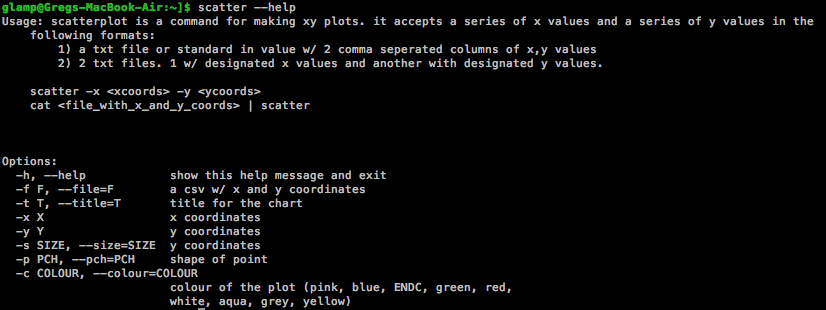 hist takes input from either stdin or specified using the -f parameter. Input should be a single column of numbers. scatter takes x and y coordinates as input form either a comma delimited file using -f or from 2 different files using -x and -y.