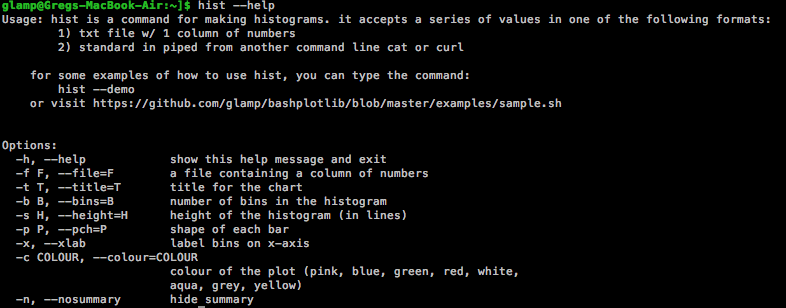 hist takes input from either stdin or specified using the -f parameter. Input should be a single column of numbers. scatter takes x and y coordinates as input form either a comma delimited file using -f or from 2 different files using -x and -y.
